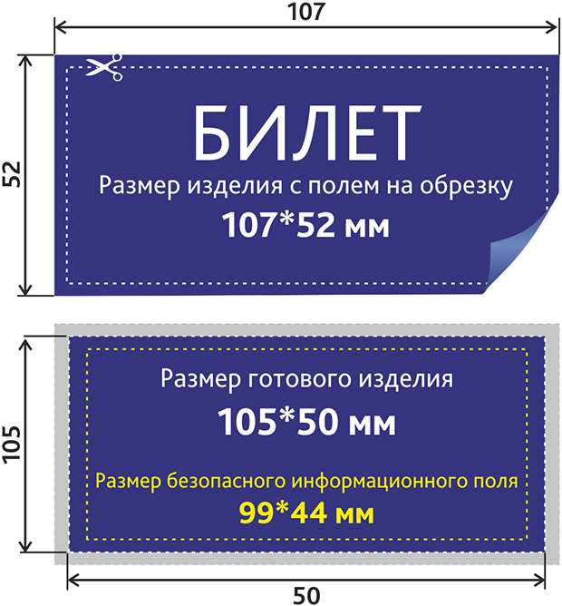 Размер билета с припусками на обрез 107x52 мм (т.е. по 1 мм с каждого края);